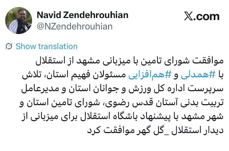 🔹 نوید زنده روحیان، نماینده باشگاه استقلال در مشهد در توئیتی از موافقت شورای تامین استان با برگزاری بازی استقلال و گل گهر در مشهد خبر داد.