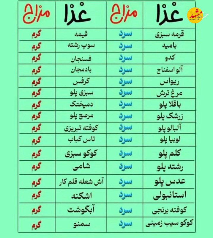 📷لیست غذاهای سرد مزاج و گرم مزاج@Akhbarmashhad Posted on دسامبر 22, 2025 📷لیست غذاهای سرد مزاج و گرم مزاج@Akhbarmashhad