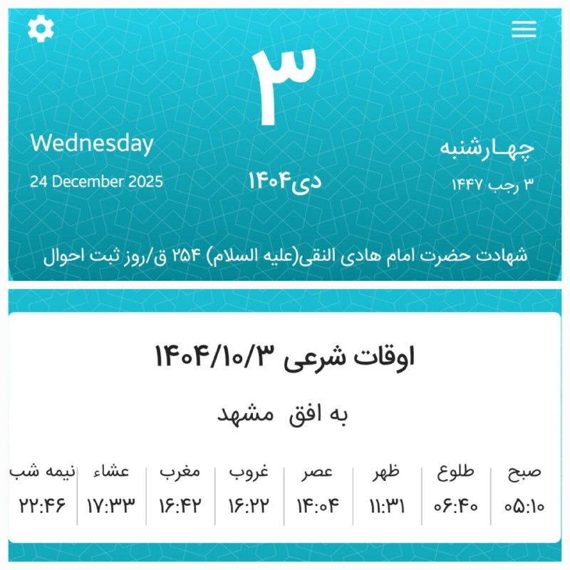 📷اوقات شرعی چهارشنبه سوم دی ماه ۱۴۰۴ به افق مشهد (احتیاط یک تا دو دقیقهای لحاظ شود)