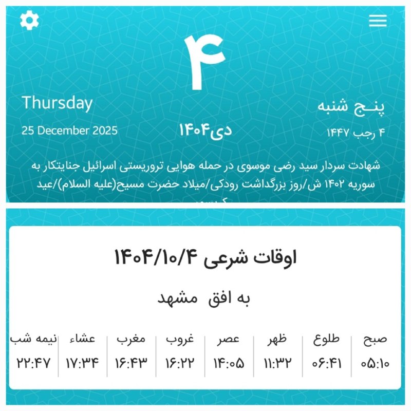 📷اوقات شرعی پنجشنبه چهارم دی ماه ۱۴۰۴ به افق مشهد (احتیاط یک تا دو دقیقهای لحاظ شود)