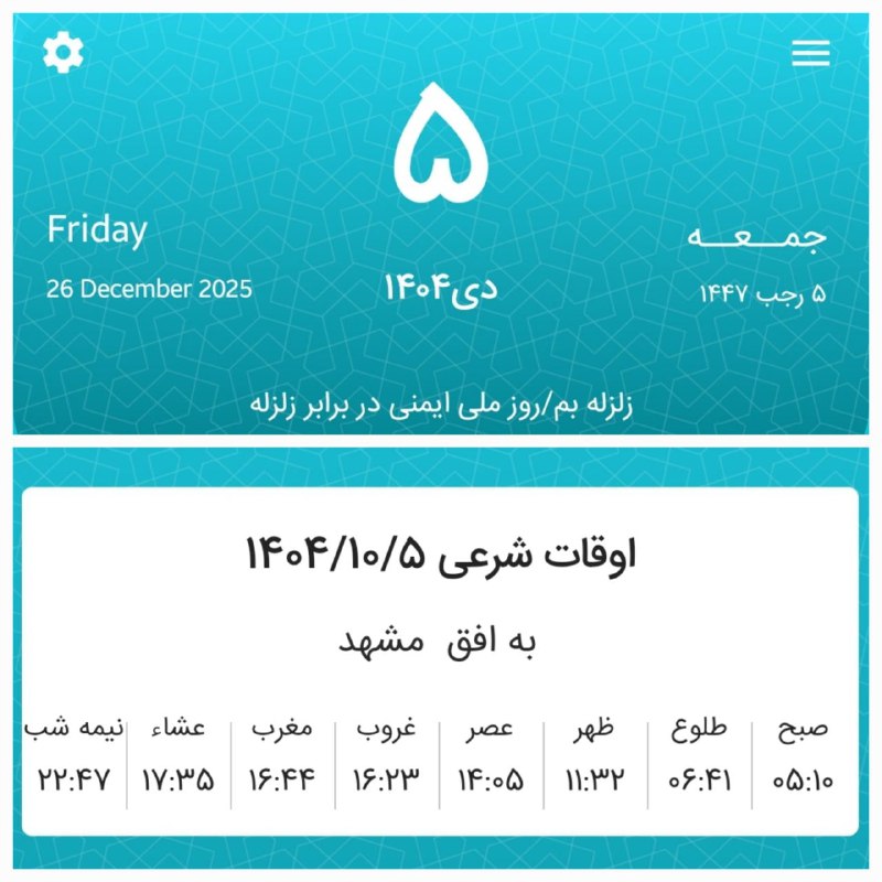 🔸اوقات شرعی جمعه پنجم دی ماه ۱۴۰۴ به افق مشهد (احتیاط یک تا دو دقیقهای لحاظ شود)