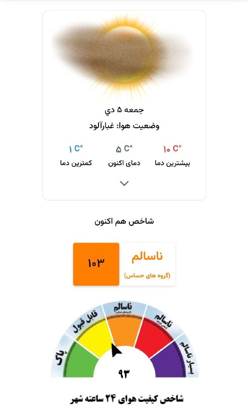 🔹همچنین طی ۲۴ ساعت گذشته وضعیت کیفیت هوا در این شهر؛ در مرز ناسالم شدن قرار داشته و با عدد ۹۳ کیفیت قابل قبولی را ثبت کرده است.
