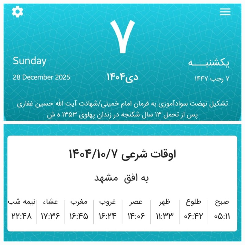 📷اوقات شرعی یکشنبه هفم دی ماه ۱۴۰۴ به افق مشهد (احتیاط یک تا دو دقیقهای لحاظ شود)