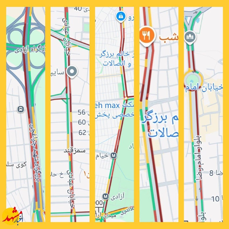 🔹هم اکنون ترافیک سنگین در بلوار امام رضا، بلوار احمد آباد، خیابان خیام ، خیابان ملک‌آباد، خیابان عبادی و بزرگراه کلانتری