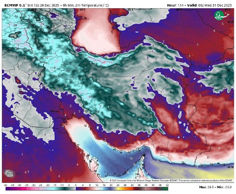 🔹بیشتر در غرب ، شمالغرب ، زاگرس مرکزی و ارتفاعات شمالی ایران، دما تا ۱۰ تا ۳۰ درجه زیر صفر می رود.