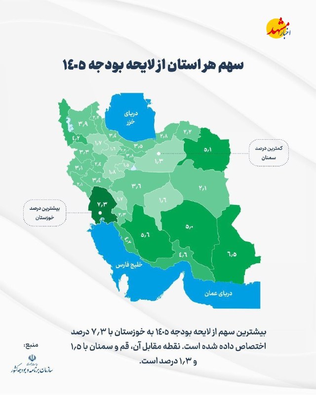 🔹بیشترین سهم از لایحه بودجه ۱۴۰۵ به خوزستان با ۷/۳ درصد اختصاص داده شده است. نقطه مقابل آن، قم و سمنان با ۱/۵ و ۱/۳ درصد است.