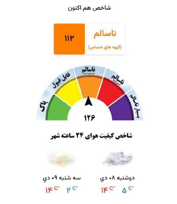 🔹کیفیت هوای مشهد با شاخص لحظه‌ای ۱۱۲ و شاخص ۲۴ ساعته ۱۲۶ برای گروه‌های حساس ناسالم است.