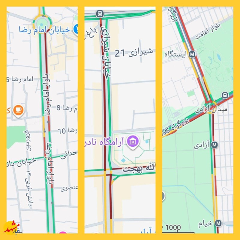 🔹هم اکنون ترافیک سنگین در بزرگراه کلانتری، خیابان ملک آباد، میدان آزادی ، خیابان شیرازی و بلوار امام رضا