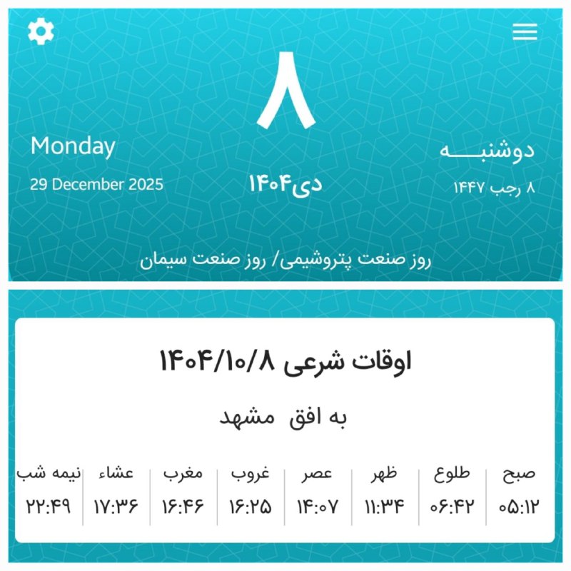 🔸اوقات شرعی دوشنبه هشتم دی ماه ۱۴۰۴ به افق مشهد (احتیاط یک تا دو دقیقهای لحاظ شود)