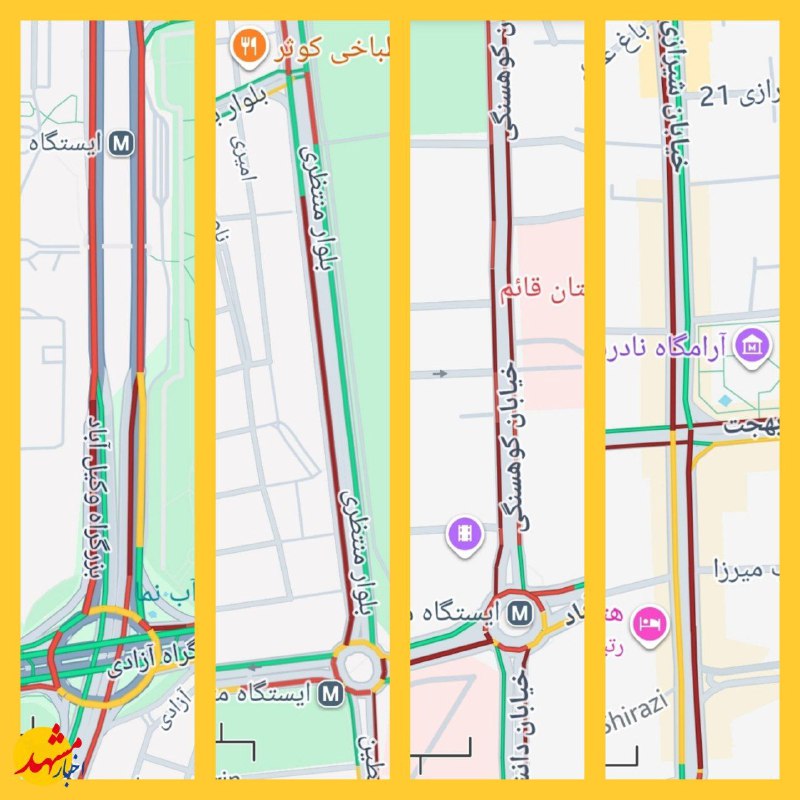 🔹هم اکنون ترافیک سنگین در خیابان شیرازی، خیابان آیت الله بهجت، خیابان کوهسنگی، خیابان دانشگاه، بلوار منتظری،بلوار فلسطین و بزرگراه وکیلآباد