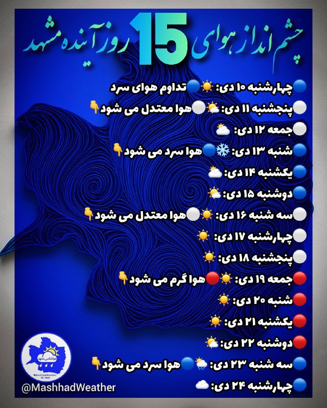 👁چشم انداز هوای ۱۵ روز آینده مشهد❄️هواشناسی خصوصی مشهد👇
