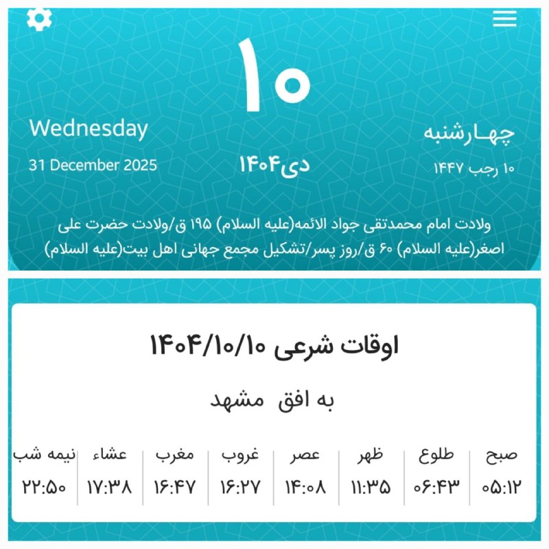📷اوقات شرعی چهارشنبه دهم دی ماه ۱۴۰۴ به افق مشهد (احتیاط یک تا دو دقیقهای لحاظ شود)
