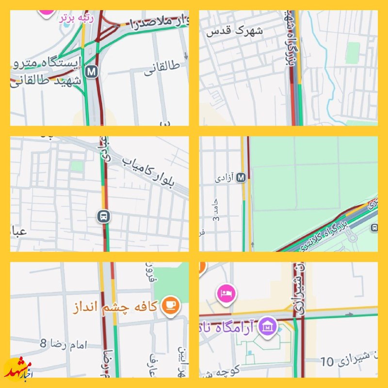 🔹هم اکنون ترافیک سنگین بزرگراه شهید کلانتری، بزرگراه شهید چراغچی، بلوار احمد آباد، بلوار ملک آباد، خيابان عبادی، خیابان شیرازی، خیابان امام رضا(ع)
