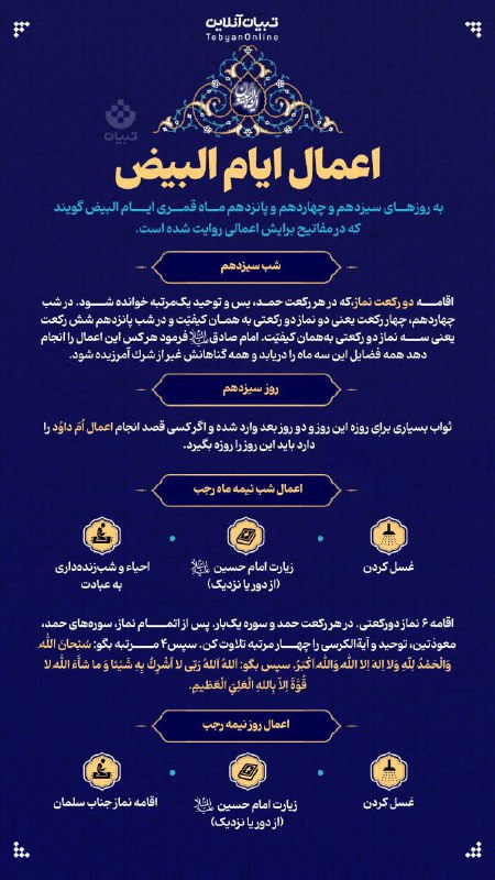 🔹 به روزهای سیزدهم و چهاردهم و پانزدهم ماه قمری ایام البیض گویند که در مفاتیح برایش اعمالی روایت شده است.