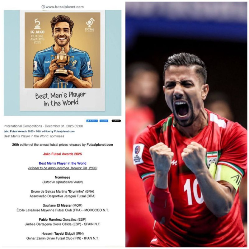 🔹حسین طیبی، ملیپوش ارزشمند مشهدی فوتسال ایران، برای پنجمین بار در دوران حرفهای خود در فهرست نامزدهای عنوان بهترین بازیکن فوتسال جهان قرار گرفت.این انتخاب از سوی سایت معتبر Futsalplanet و در چارچوب جوایز سالانه فوتسال جهان انجام شده است.