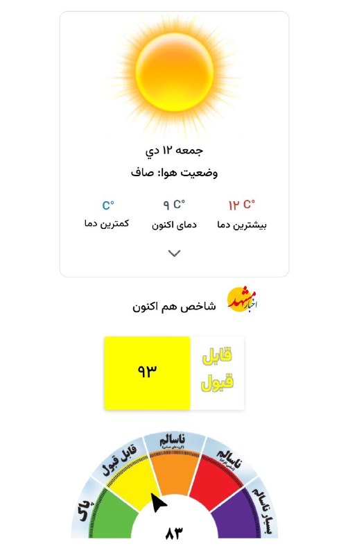 🔹شاخص کیفیت هوای مشهد در حال حاضر با ثبت عدد ۹۳ در وضعیت قابل قبول قرار دارد.