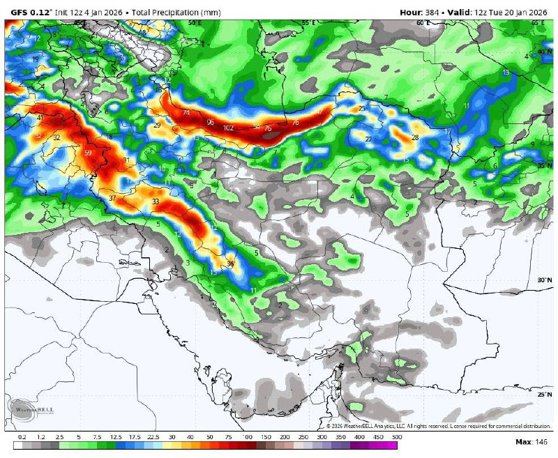 🌧️آپدیت جدید مدل GFS; مجموع بارش باران و برف طی ۱۶ روز آینده