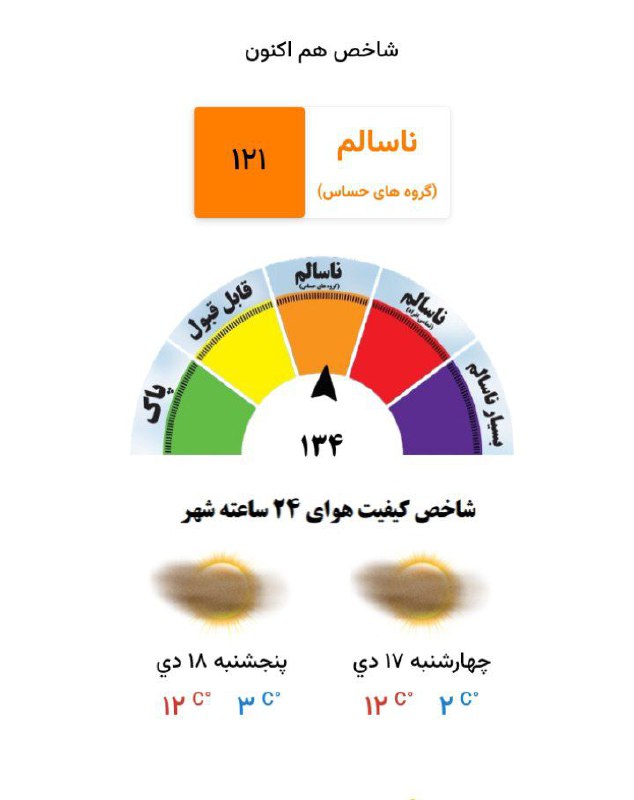 🔹شاخص ۲۴ ساعته نیز با عدد ۱۳۴ ماندگاری هوای ناسالم برای گروههای حساس را نشان میدهد.