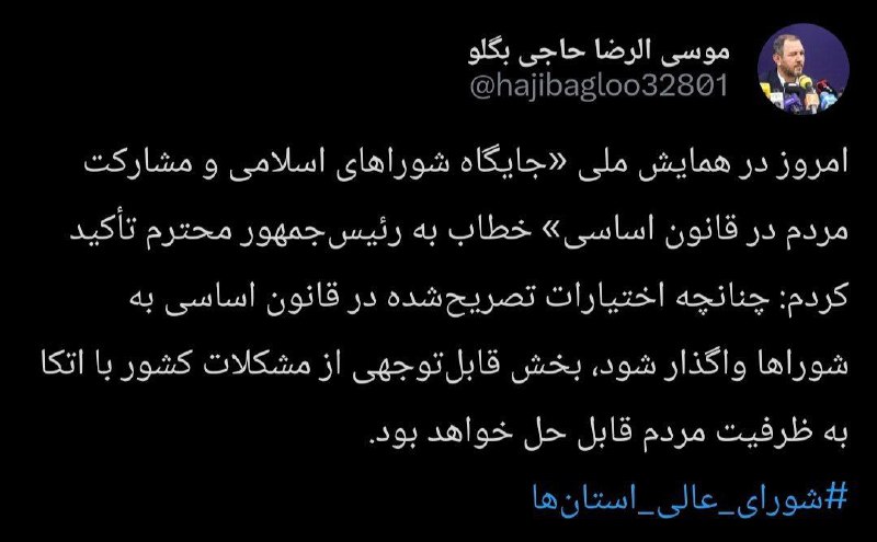 🔹در صورتی که اختیارات تصریحشده در قانون اساسی به شوراها واگذار شود، بخش قابل توجهی از مشکلات کشور با اتکا به ظرفیت مردم و مشارکت محلی قابل حل خواهد بود.
