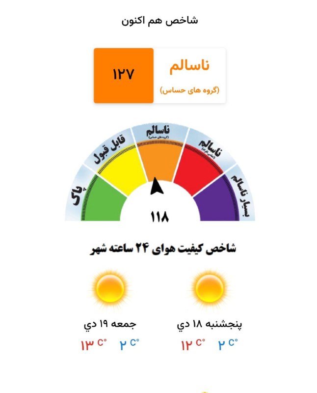 🔸همچنین میانگین شاخص کیفیت هوا در ۲۴ ساعت گذشته عدد ۱۱۸ را نشان میدهد که بیانگر قرار گرفتن هوا در محدوده ناسالم است.