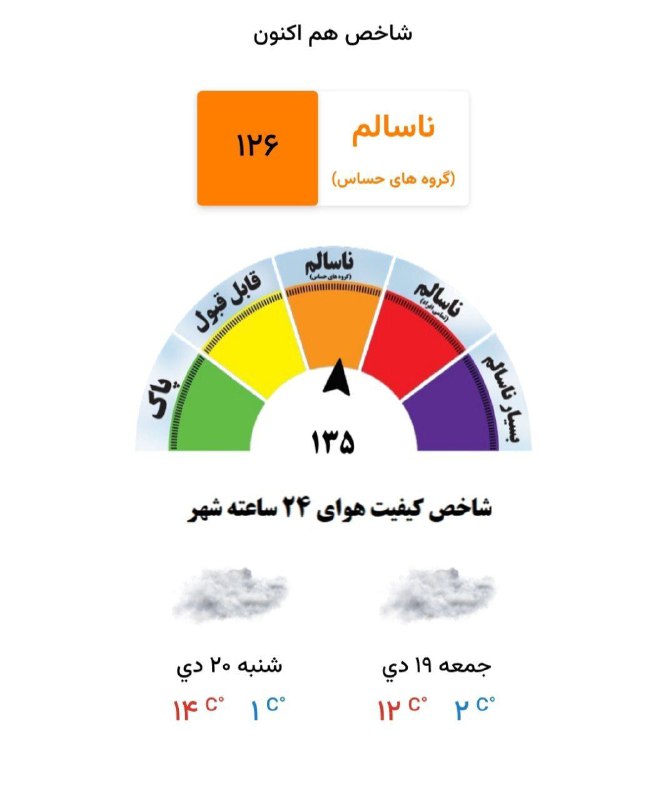 🔹همچنین میانگین شاخص کیفیت هوا در ۲۴ ساعت گذشته عدد ۱۳۵ را نشان میدهد که بیانگر قرار گرفتن هوا در محدوده ناسالم است.