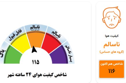 🔹شاخص کیفیت هوای شهر مشهد در ۲۴ ساعت گذشته به عدد ۱۱۵ رسیده و وضعیت هوا در محدوده ناسالم برای گروههای حساس قرار گرفته است؛ همچنین امروز شاخص کیفیت هوای شهر به عدد ۱۱۶ رسیده و در وضعیت نارنجی قرار دارد.