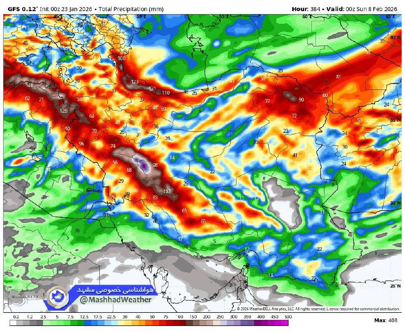 🌧️آپدیت جدید مدل GFS; مجموع احتمالی بارش باران و برف طی ۱۶ روز آینده
