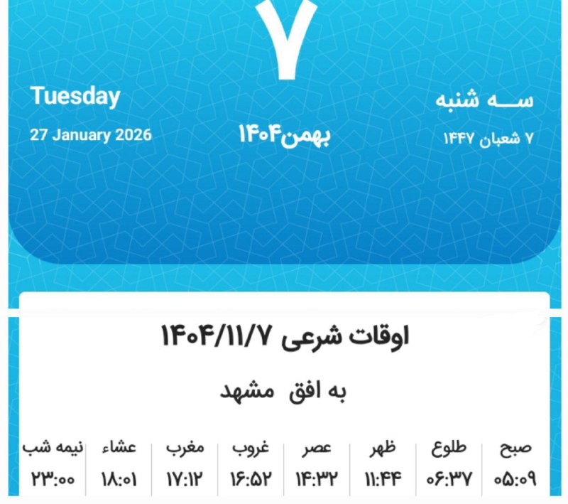 📷اوقات شرعی سهشنبه هفتم بهمن ماه ۱۴۰۴ به افق مشهد (احتیاط یک تا دو دقیقهای لحاظ شود)