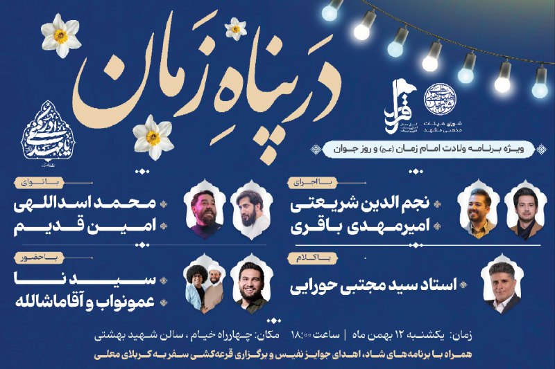 ▪به مناسب ولادت باسعادت مهدی موعود (عج) در ویژه برنامه «ولادت حضرت» و «روز جوان» در کنار همه شما خانواده‌ها و جوانان مشهدی گرد هم می‌آییم.