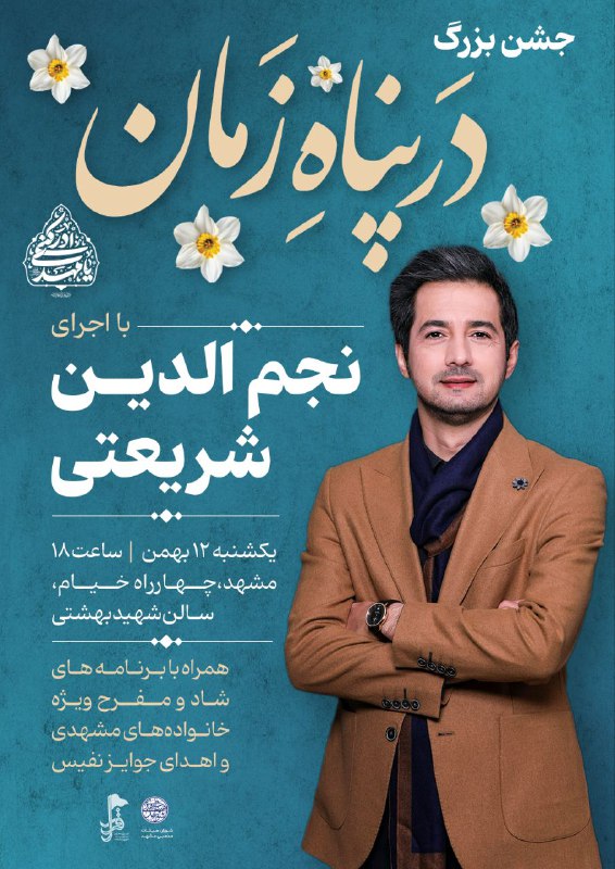 ✨هیأت قرار در جشن بزرگ “در پناهِ زمان” به مناسبت تولد منجی عالم بشریت و روز جوان، با اجرای نجم الدین شریعتی میزبان شما مشهدی های عزیز است.