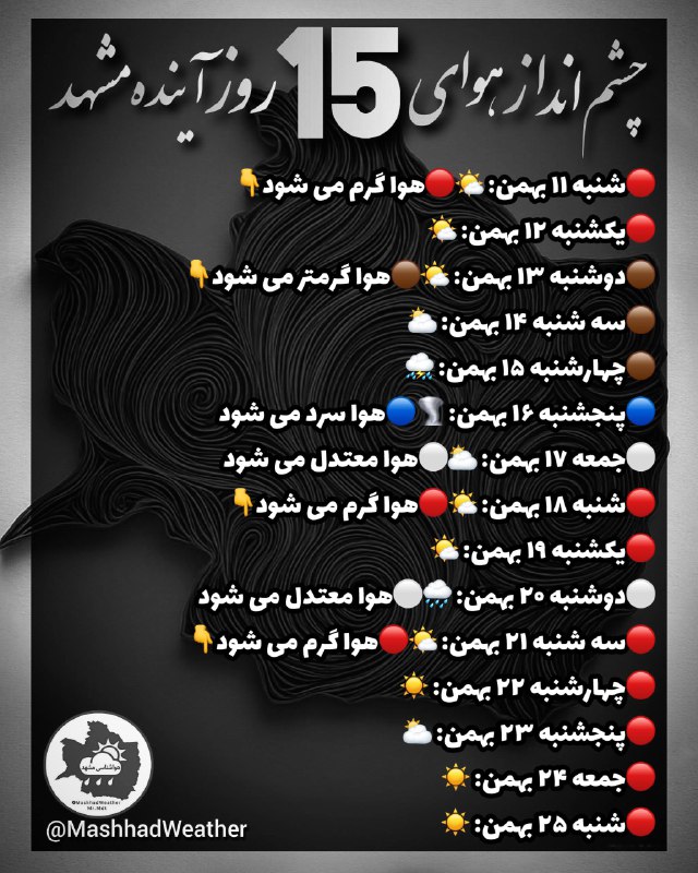 ⚫️ چشم انداز هوای ۱۵ روز آینده مشهد❄️هواشناسی خصوصی Posted on فوریه 1, 2026 ⚫️ چشم انداز هوای ۱۵ روز آینده مشهد ❄️هواشناسی خصوصی مشهد👇 @MashhadWeather