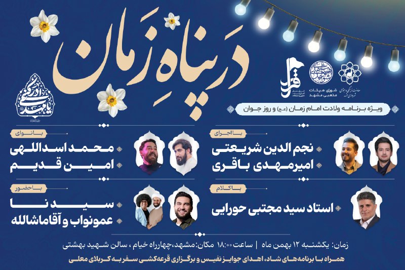 ✨ مشهدی های عزیز! به مناسب «ولادت باسعادت صاحب الزمان» و «روز جوان» در جشن بزرگ «در پناه زمان » میزبان قدوم مهربان تان هستیم.