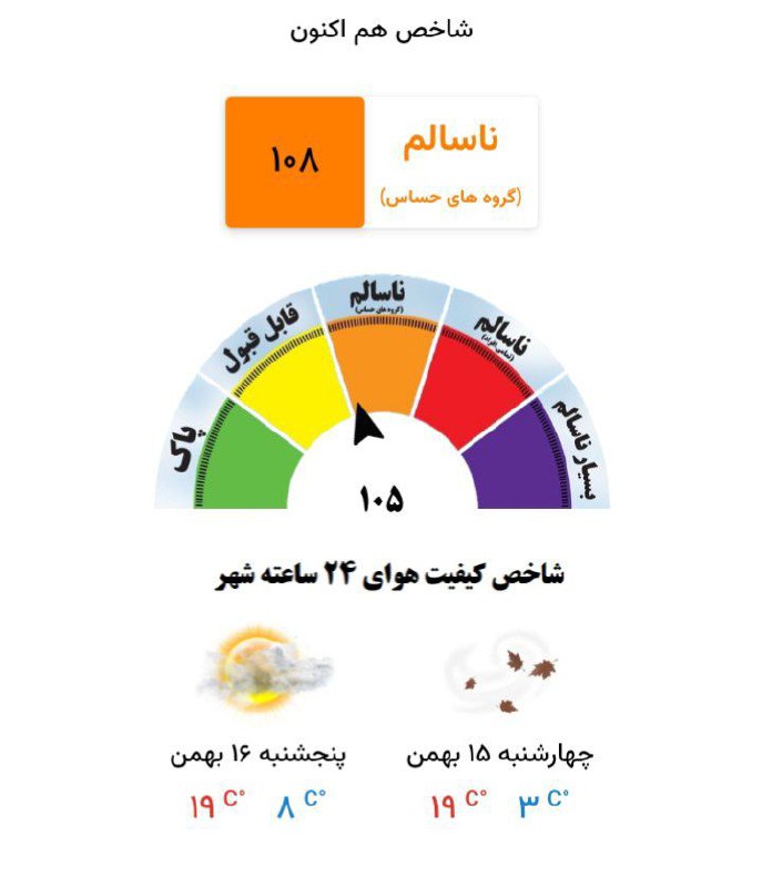 🔹کیفیت هوای هماکنون مشهد با شاخص ۱۰۸ برای گروههای حساس در محدوده ناسالم قرار گرفت.