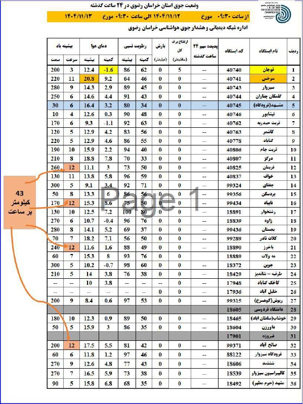 📊 وضعیت جوی ۲۴ ساعت گذشته استان خراسان رضوی