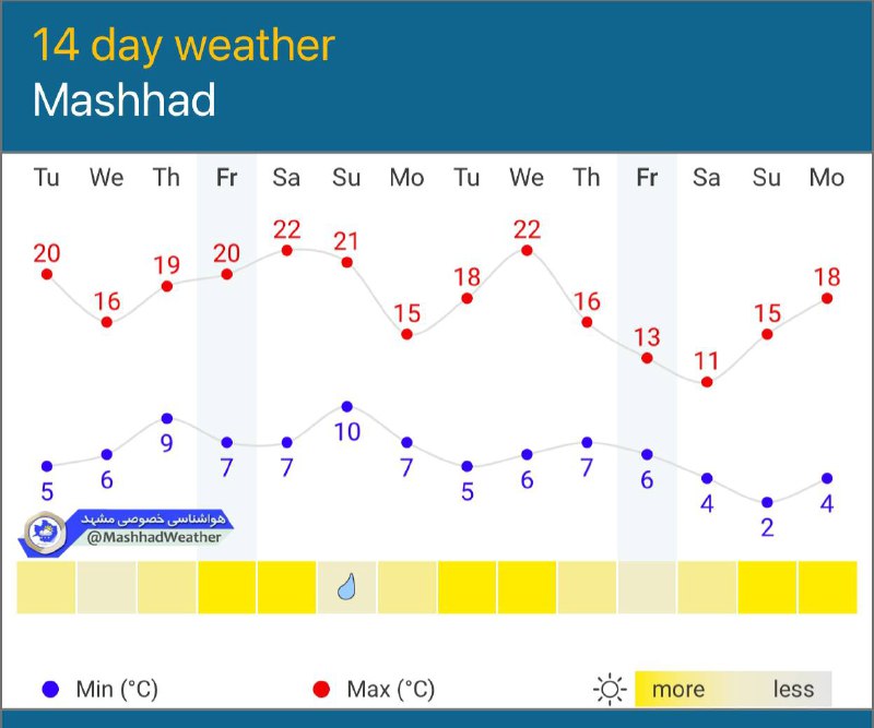 🌡️ نمودار دمایی مشهد طی ۱۴ روز آینده