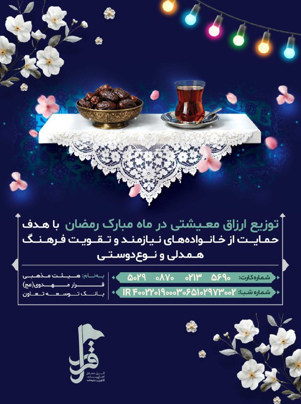 🤲 در آستانه ماه پر خیر و برکت رمضان هیأت قرار به پشتوانه و همراهی همیشگی شما خوبان برآن شد تا اقدام به تهیه و توزیع ارزاق معیشتی و برگزاری مراسمات معنوی این ماه بزرگ کند.