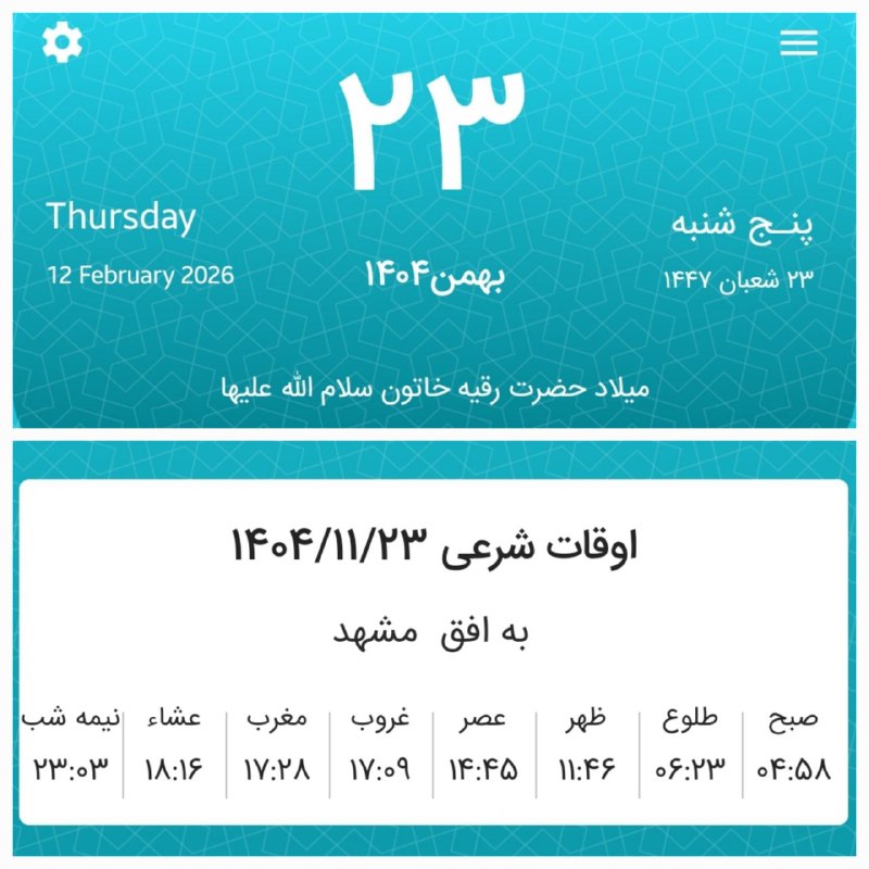 📷اوقات شرعی پنجشنبه بیستو سوم بهمن ماه ۱۴۰۴ به افق مشهد (احتیاط یک تا دو دقیقهای لحاظ شود)