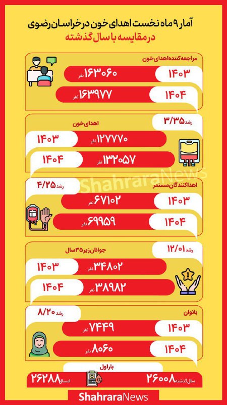 📷آمار ۹ ماه نخست اهدای خون در خراسان رضوی Posted on فوریه 14, 2026 📷آمار ۹ ماه نخست اهدای خون در خراسان رضوی در مقایسه با سال گذشته@Akhbarmashhad