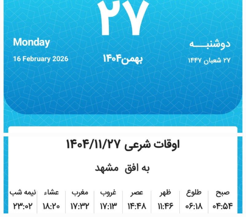 📷اوقات شرعی دوشنبه بیستوهفتم بهمن ماه ۱۴۰۴ به افق مشهد (احتیاط یک تا دو دقیقهای لحاظ شود)