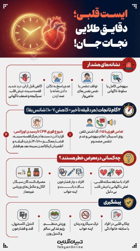 🔹 ایست قلبی یعنی توقف ضربان قلب که جریان خون و اکسیژنرسانی به مغز و ارگانها رو متوقف میکنه. هر دقیقه تأخیر در شروع احیا شانس بقا را کاهش میده.