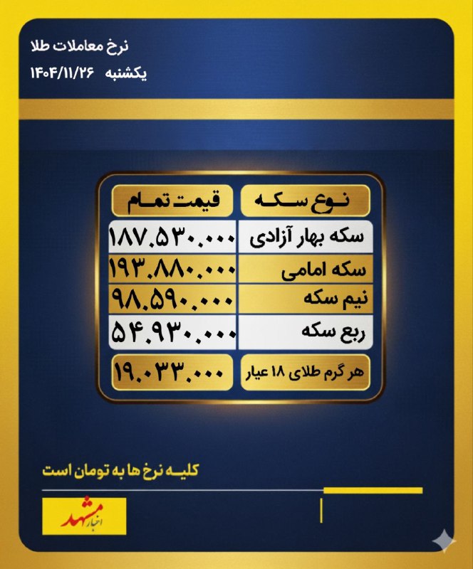 🔸 نرخ معاملات طلا و سکه #نرخ_طلا@Akhbarmashhad Posted on فوریه 15, 2026 🔸 نرخ معاملات طلا و سکه #نرخ_طلا@Akhbarmashhad