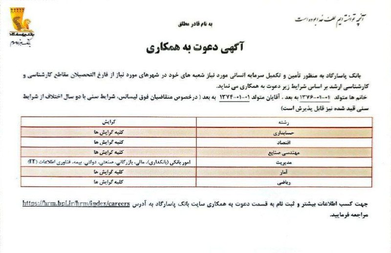 🔹 دعوت به همکاری بانک پاسارگادبانک پاسارگاد به منظور