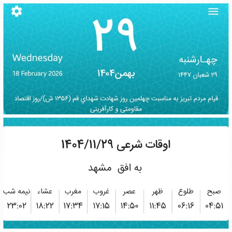 📷اوقات شرعی چهارشنبه بیستونهم بهمن ماه ۱۴۰۴ به افق مشهد (احتیاط یک تا دو دقیقهای لحاظ شود)