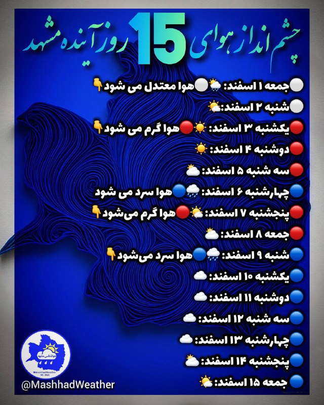 👁️ چشم انداز هوای ۱۵ روز آینده مشهد❄️هواشناسی خصوصی Posted on فوریه 19, 2026 👁️ چشم انداز هوای ۱۵ روز آینده مشهد ❄️هواشناسی خصوصی مشهد👇 @MashhadWeather