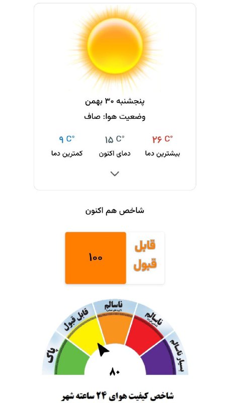 🔹شاخص کیفیت هوای شهر مشهد هم اکنون به عدد ۱۰۰ رسیده و وضعیت هوا در محدوده نارنجی و ناسالم برای گروههای حساس قرار گرفته است