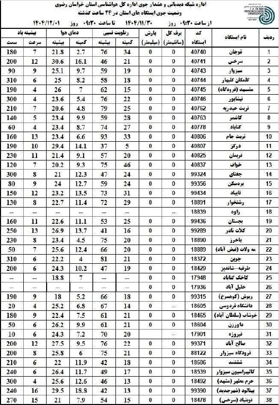🔸 وضعیت جوی استان خراسان رضوی طی ۲۴ ساعت گذشته