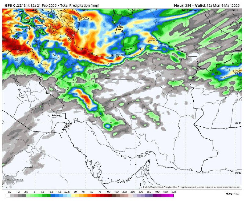 🌧️آپدیت جدید مدل GFS; مجموع احتمالی بارش باران و برف طی ۱۶ روز آینده