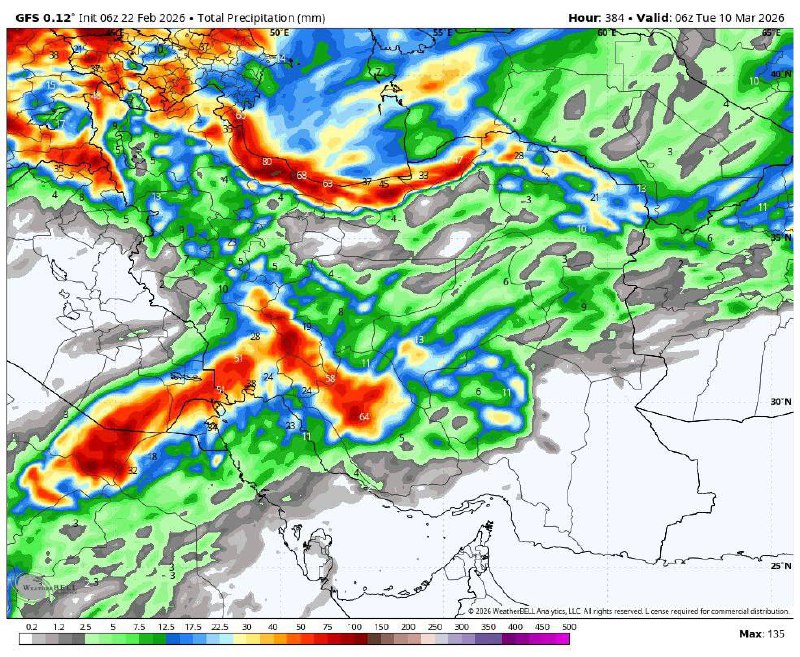 🌧️آپدیت جدید مدل GFS; مجموع احتمالی بارش باران و برف طی ۱۶ روز آینده
