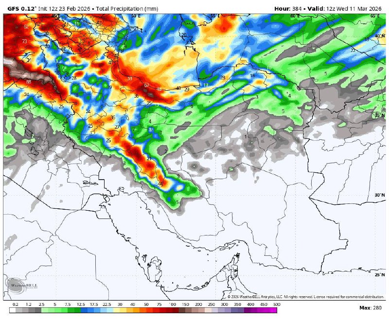 🌧️آپدیت جدید مدل GFS; مجموع احتمالی بارش باران و برف طی ۱۶ روز آینده