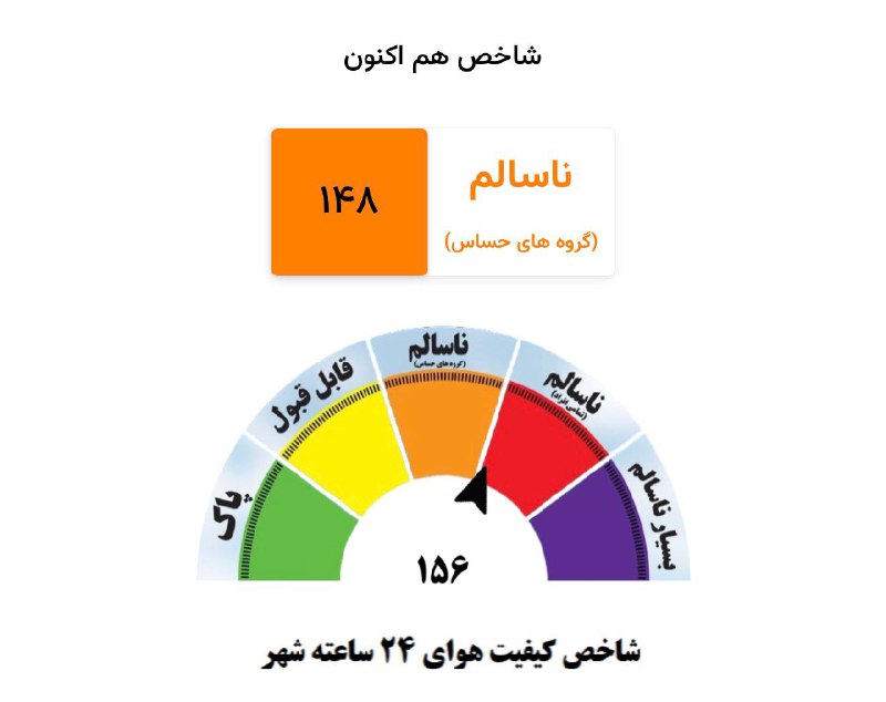😷کیفیت هوای هم اکنون مشهد ناسالم برای گروه های Posted on فوریه 23, 2026 😷کیفیت هوای هم اکنون مشهد ناسالم برای گروه های حساس 📊شاخص عددی هم اکنون ۱۴۸ ❄️هواشناسی خصوصی مشهد👇 @MashhadWeather